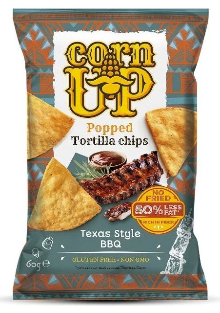 Kukurydziane Prażone nachosy ultra chrupiące, doskonale wypieczone (nie smażone w głębokim tłuszczu) pełnoziarniste trójkątne chipsy kukurydziane z żółtej kukurydzy z oliwą z oliwek i przyprawami barbecue, z czosnkiem, cebulą, ziołami i suszonymi pomidorami.