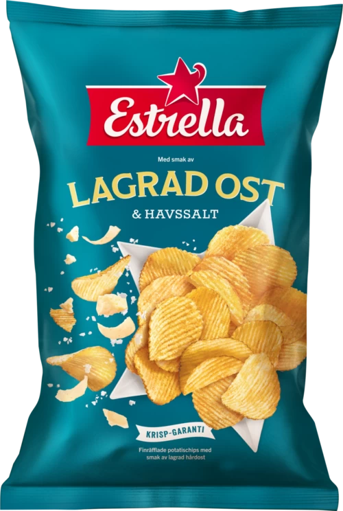 "Lagrad Ost & Havssalt" tłumaczy się jako "Dojrzały Ser i Sól Morska". Drobno karbowane chipsy ziemniaczane o doskonale zbilansowanym serowym smaku dojrzewających, twardych serów. Kremowy o doskonałej słoności