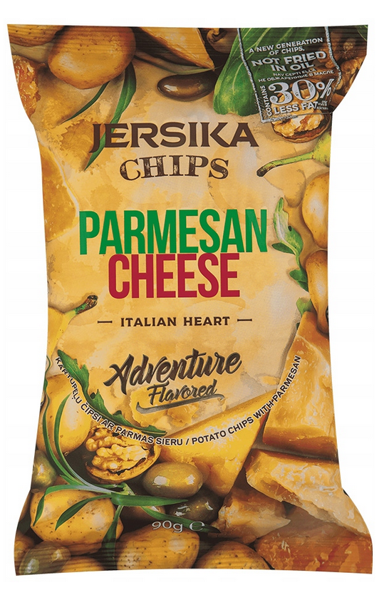 Chipsy ziemniaczane o smaku sera parmezan marki Jersika’s to przekąska, która od razu przyciąga uwagę nie tylko intensywnym smakiem, ale i samą marką – oryginalnie pochodzącą z Łotwy, znaną z bardziej rzemieślniczego podejścia do produkcji. Już na pierwszy rzut oka widać, że Jersika’s stawia na estetykę i jakość – opakowanie jest nowoczesne, wyróżnia się spośród typowych plastikowych toreb chipsów, co sugeruje bardziej „premium” charakter produktu.