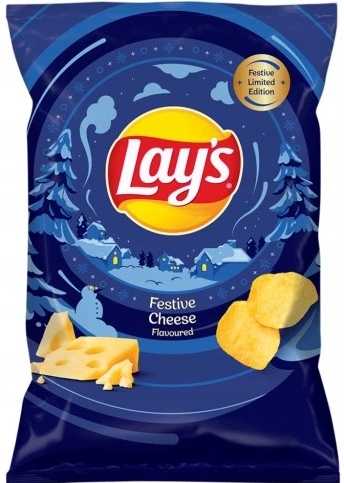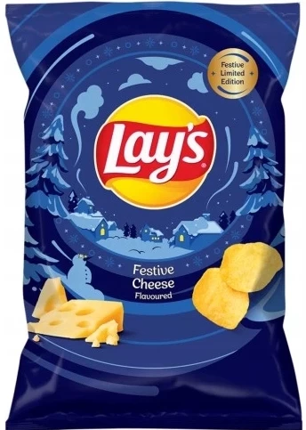 Opakowanie Festive Cheese Lays jest stylizowane w świąteczne motywy, z dominującymi kolorami błękitu i bieli, co dodaje im jeszcze więcej uroku i sprawia, że idealnie nadają się na świąteczne spotkania z rodziną i przyjaciółmi.