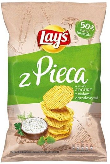 Chipsy Lay's Prosto z Pieca o smaku Jogurtu z Ziołami to delikatna i orzeźwiająca przekąska, która łączy w sobie kremowy smak jogurtu z wyrazistymi aromatami świeżych ziół. Charakteryzują się one lekkim, świeżym smakiem jogurtu, który jest wzbogacony o nuty ziół, takie jak koper, szczypiorek czy natka pietruszki.