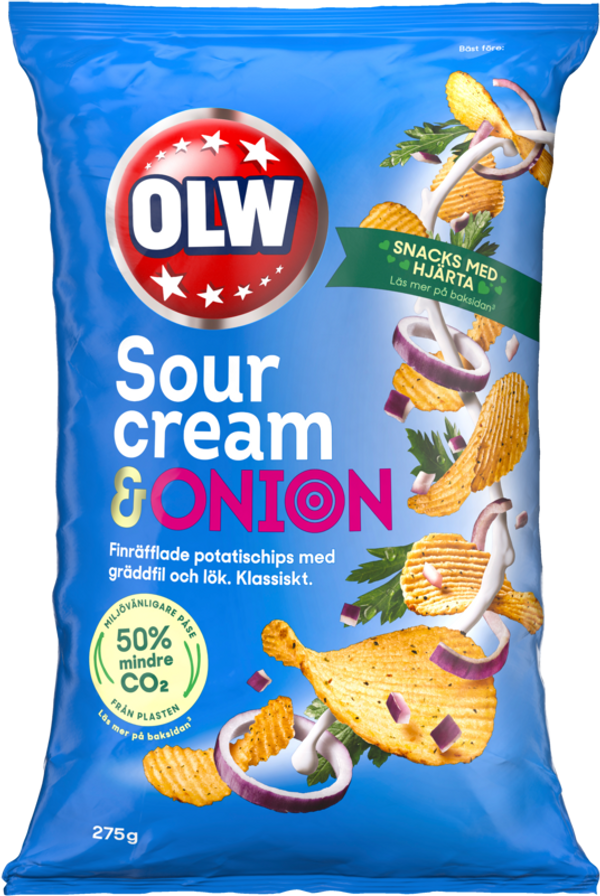OLW Sour Cream & Onion to chipsy o kremowym smaku śmietanki i aromatycznej cebuli. Ich chrupkość i wyrazisty smak czynią je popularną przekąską na wieczór przed telewizorem czy podczas spotkań ze znajomymi.