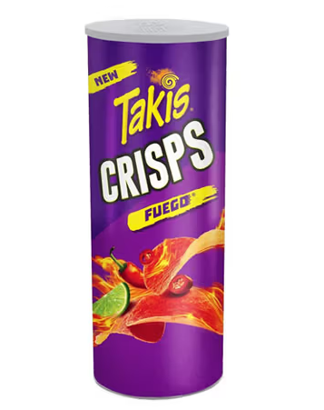 Takis Crisps to chipsy przypominające Pringles zarówno pod względem opakowania jak i wyglądu samego chipsa. Fuego to najostrzejsza przyprawa z serii Takis, mieszanka ostrej papryczki chili i limonki.