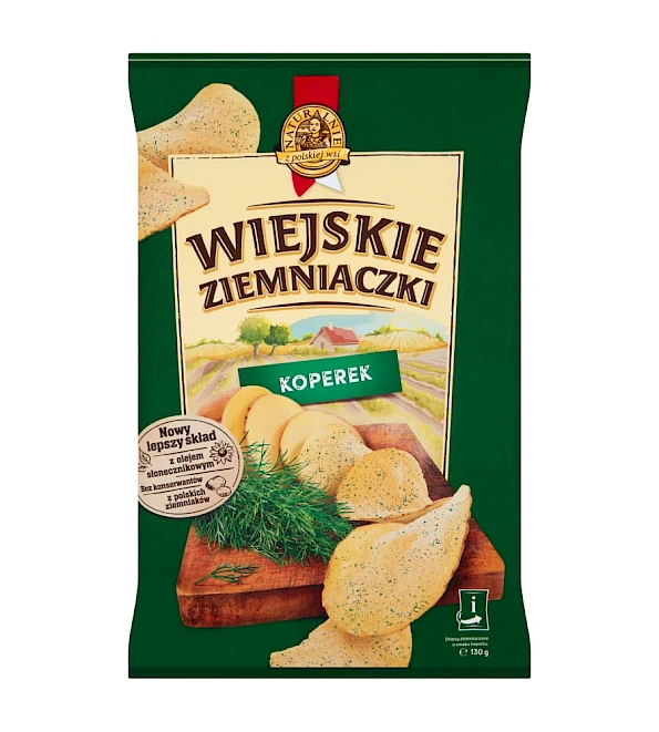 Wiejskie Ziemniaczki o smaku koperkowym mają delikatną i orzeźwiającą nutę i faktycznie przy kilku pierwszych chipsach smakują koperkowo jednak po jakimś czasie ten smak staje się trudny do określenia. Dobrze wypieczone i cieniutkie. Troche zbyt tłuste ale nie przeszkadza to specjalnie podczas konsumpcji.
